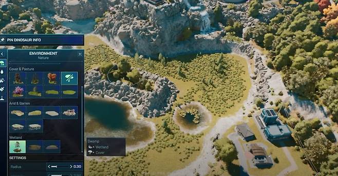 '쥬라이 월드 에볼루션 3'의 공원 조형은 이들의 전작인 '플래닛 코스터2'와 무척 닮아 있다. 지형의 고저차와 식생의 배치는 물론, 호수와 바위 등도 자유롭게 구성을 바꿀 수 있다.