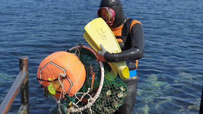인터뷰를 위해 그가 물질 장비를 들고 뭍으로 올라왔다. 많은 해산물이 보인다.