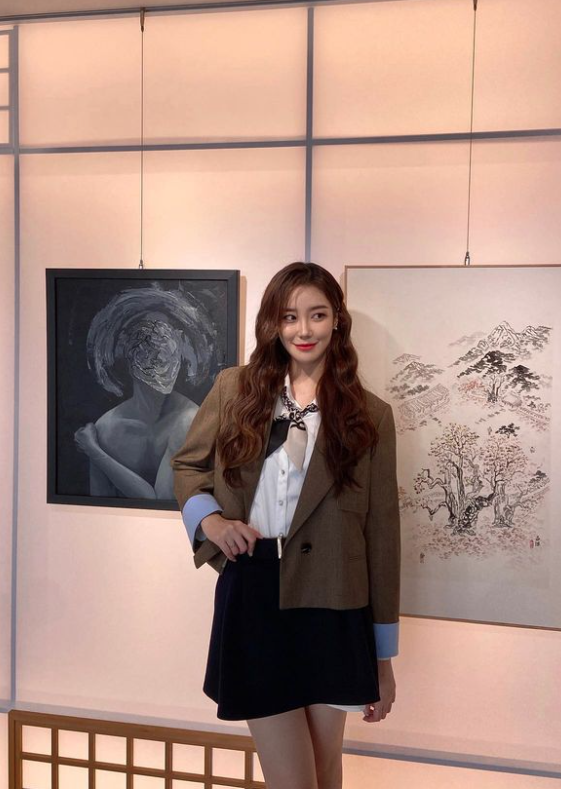 이승현 양은 데이트룩으로 브라운 계열 원버트 자켓에 플레어 스커트를 매치한 스타일을 선보였네요.