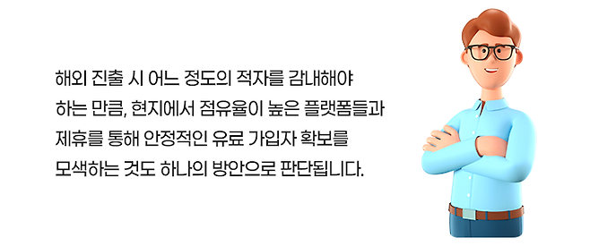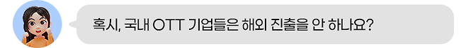 그건 아닙니다. 현재 한국 OTT 업체들도 글로벌 시장에 진출해 입지를 강화하고 있습니다. SK텔레콤과 지상파 3사의 합작으로 2019년에 서비스를 시작한 웨이브는 2022년에 북중남미 30개국 이상에서 K-콘텐츠를 제공하고 있는 코코와(KOCOWA)를 인수하고 글로벌 진출을 본격화하였습니다.