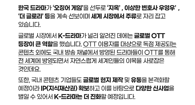 이에 체계화된 제작 시스템, 수준 높은 인력, 뛰어난 가성비 등을 바탕으로 퀄리티 높은 영화, 드라마 등을 만들어 낼 수 있는 한국의 콘텐츠 기업들이 글로벌 OTT의 많은 투자를 받고 있으며, 이를 통해 K-콘텐츠 또한 글로벌 시장에 진출해 큰 성공을 거두고 있습니다.