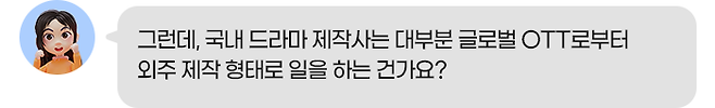그러다가 2010년대에 들어 글로벌 OTT의 외주 제작이 새로운 수익모델로 등장하였고, ‘오징어 게임’, ‘킹덤’ 등이 외주 제작 형태였는데, 드라마는 글로벌 흥행에 성공하였지만, IP는 OTT가 가져갔기 때문에 아쉽지만 제작사는 큰 수익을 내기 힘들었습니다.