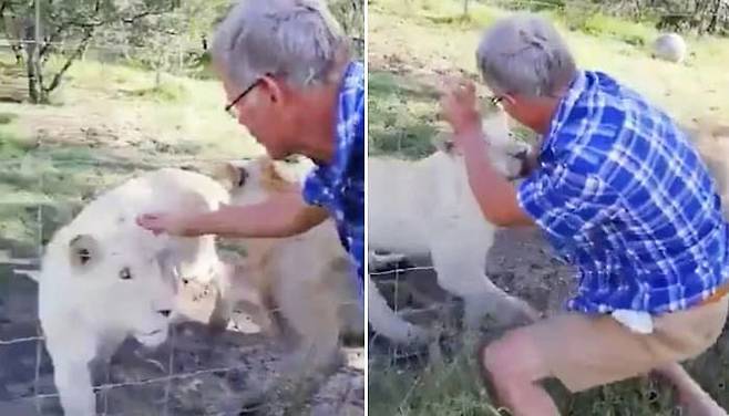 암사자는 순식간에 피테르의 팔을 낚아채듯 물어버렸고, 철망 바깥으로 끌어당기기 시작했습니다.
