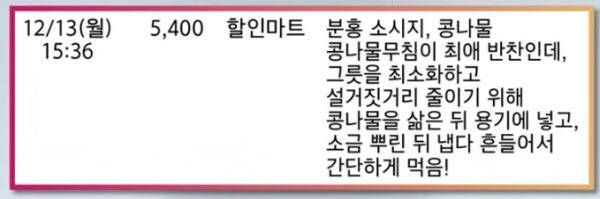 그는 할인마트에서 5400원으로 장을 봤다. 5400원은 소비한 영수증 내역 중 꽤 큰 돈이다. 그는 할인마트에서 분홍 소시지와 콩나물을 샀다. 콩나물은 설거지 거리를 줄이기 위해 삶아서 간단히 소금만 뿌려 먹는다.