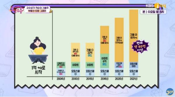 해당 아파트와 오피스텔, 근린상가는 10년간 가격이 수직 상승했고, 2015년 시세차익이 14억원에 이를 정도로 가격이 뛰어올랐다. 3억원이었던 아파트는 6억원에 매도했다. 2016년 부동산들을 처분한 자금으로 현재 보유한 건물을 15억원에 매수했는데 현재까지 40억원대로 가치가 치솟았다.