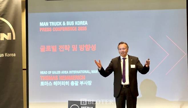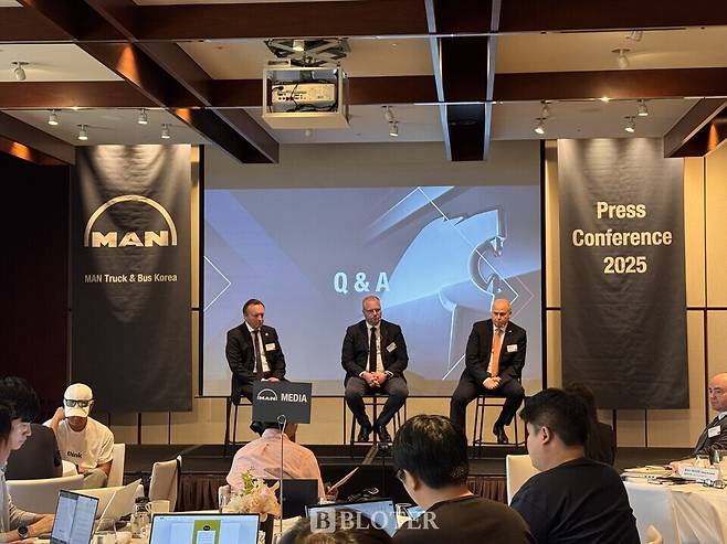 만트럭버스코리아는 26일 서울 용산구 그랜드하얏트서울 호텔에서 기자간담회를 열고 서비스 고도화와 자체 전동화 전략 등을 공개했다. 이 자리에는 토마스 헤머리히 만트럭버스그룹 판매 총괄 수석 부사장, 예스퍼 나이스트룀 만파이낸셜서비스 지역 총괄 디렉터, 피터 안데르손 만트럭버스코리아 사장 등이 참석했다.