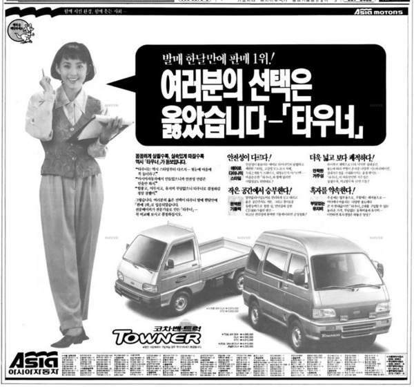 타우너는 1992년, 당시 아시아자동차가 출시한 경상용 밴/트럭으로, 대우국민차(현 한국지엠)의 다마스·라보와 직접 경쟁하며 등장했다. 출시 초기에는 ‘다마스의 대항마’, 심지어는 ‘경차계의 반격’이라는 별칭까지 붙으며 주목받았다. 실제로 타우너는 출시 한 달 만에 다마스 판매량을 제치고 1위를 차지하기도 했다.