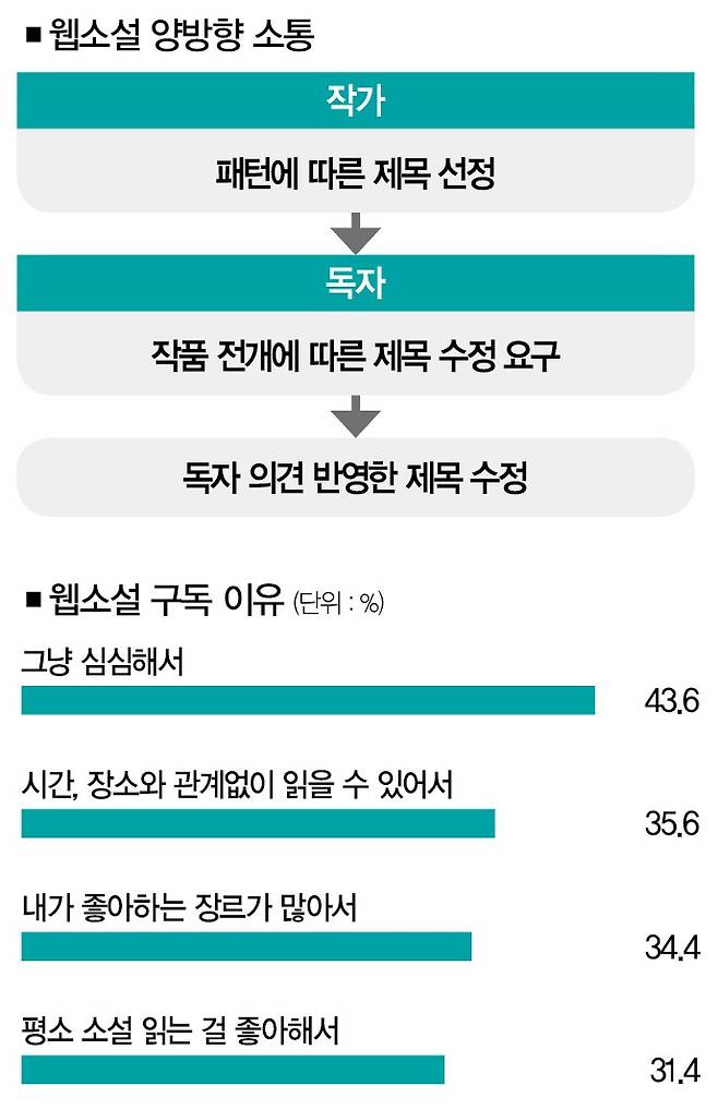 물론 이 패턴 하나만으로 「나 혼자만 레벨업」의 모든 것을 설명할 순 없다. 회귀물, 네크로맨서물, 헌터물, 작품 초반 일용직 노동자와 유사한 주인공의 사회적 위치 등 제목으로는 다 담아낼 수 없는 패턴이 작품에 녹아있다. 하지만 이를 감안해도 웹소설에서 제목이 갖는 의미는 상당하다. 만약 웹소설의 제목이 작품의 패턴을 충실히 재현하지 못하고 있다면, 독자로부터 주로 댓글을 통해 즉각적인 피드백을 받을 것이다.