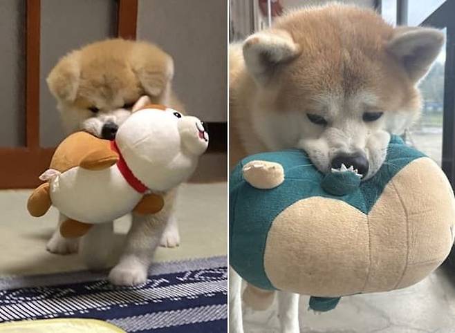 또한 인형 무는 표정도 똑같이 그대로 자란 강아지. 정말 너무 귀엽고 사랑스러운 것 아닌가요. 아무리 나이 먹고 커도 인형 좋아하는 마음은 그대로인 강아지.