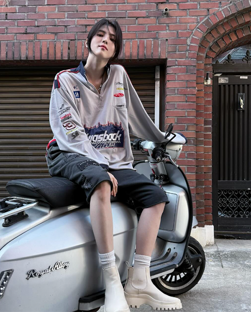 사진 속 한소희는 실버톤 스쿠터에 앉아 내추럴하면서도 강렬한 분위기를 연출하고 있다.
