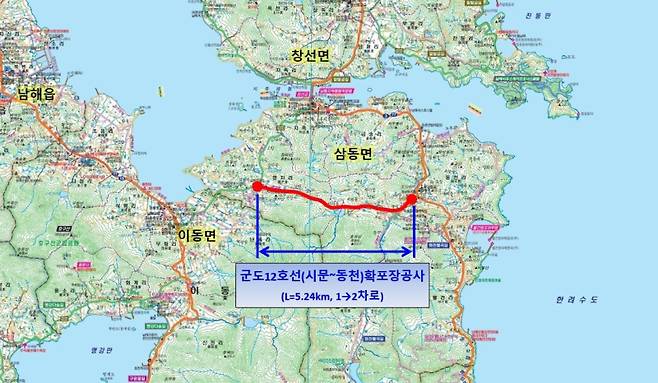 경남 남해군이 최근 '군도 12호선(시문-동천) 확포장 공사'를 착수했다.