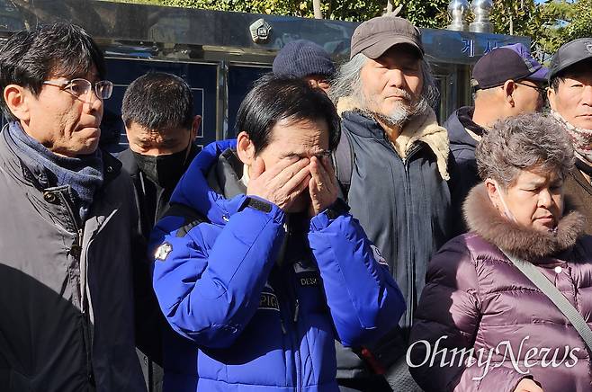 | ▲ 국가손해배상 소송에서 부산지법의 원고 승소 판결 이후 28일 법원 밖 기자회견에서 눈시울을 붉힌 채 발언을 하는 손석주 피해자협의회 대표. |