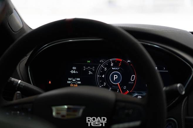 CT5-V 블랙윙의 하이라이트는 단언 주행 성능이다. 특히 파워트레인이 인상적이다. V8 6.2L 가솔린 수퍼차저 엔진을 얹고 최고출력 677마력, 최대토크 91.9㎏‧m를 뿜는다. 3,600rpm부터 쏟아내는 최대토크는 구조상 고회전이 달갑지 않은 OHV 엔진의 특성을 보완한다.
