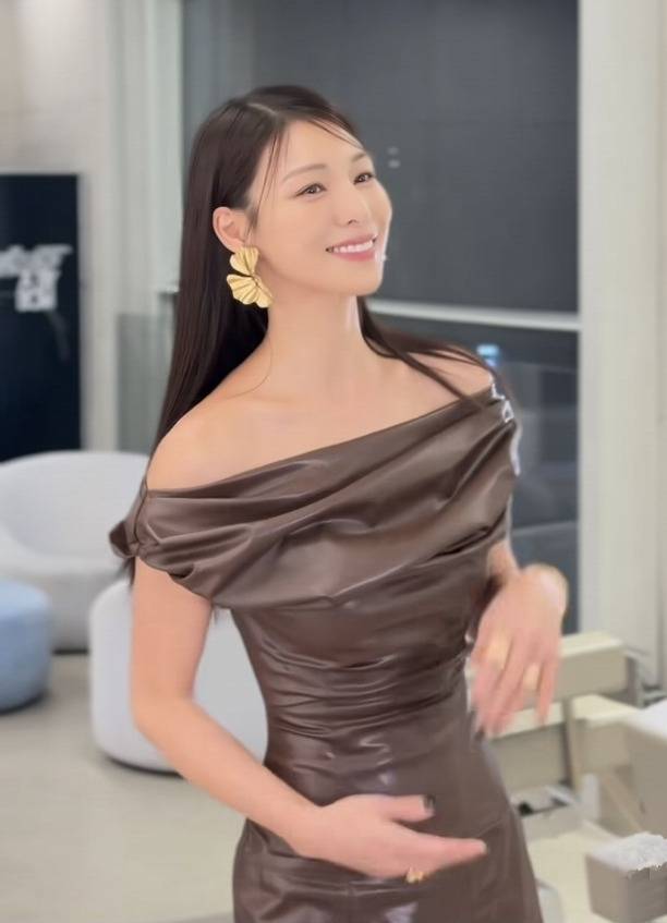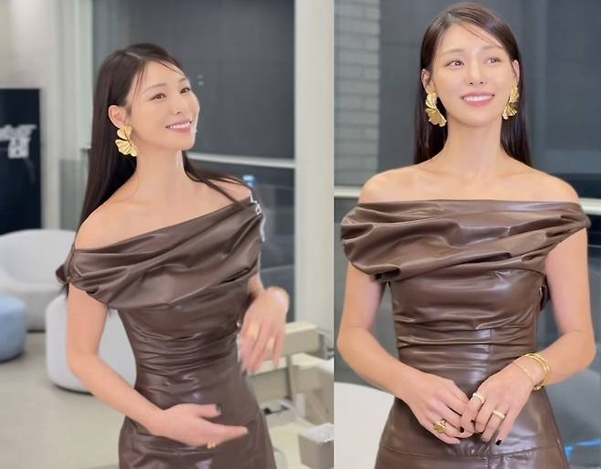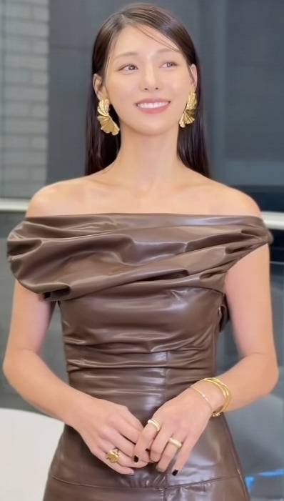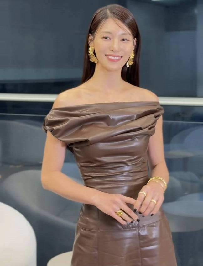 배우 김정화는 오프숄더 디자인의 초콜릿 브라운 레더 드레스로 고급스럽고 세련된 실루엣을 연출했습니다.