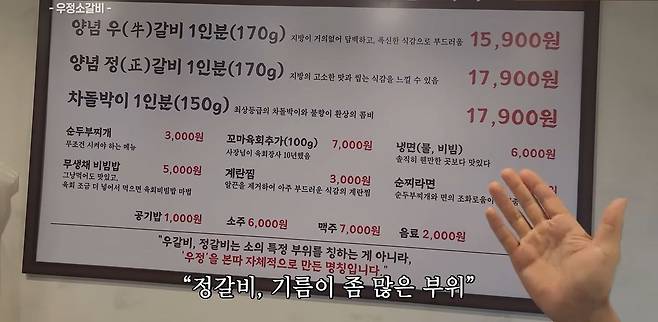 우갈비, 기름이 없는 부위고요. 정갈비, 기름이 좀 많은 부위죠. 그래서 손님의 기호에 따라서 기름기 없는 거 좋아하시는 분들은 우갈비를 드시고 기름진 거 좋아하시는 분들은 정갈비를 드시고요. 메뉴는 간소화 시켰습니다. 메뉴가 많아지게 되면 주방에서도 일이 많아지고 음식들이 빨리빨리 회전되지 않으면 식자재 로스가 날 수도 있고 신선도가 떨어지면 맛이 떨어질 수도 있고요. 그래서 최소 메뉴로 최대한 단순화 시킨 상태에서 지금 이 메뉴로 1억 판다고 하면 사람들이 다 놀라거든요.