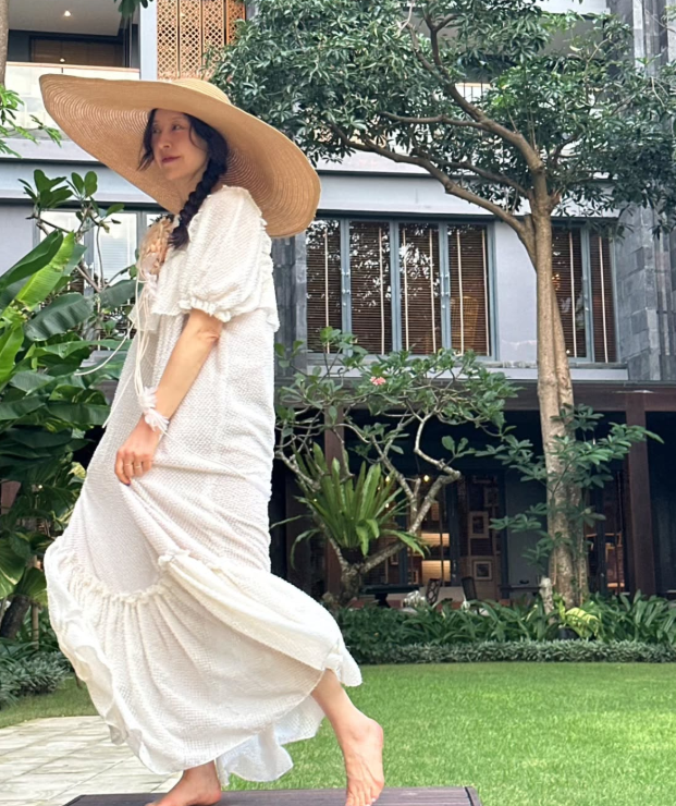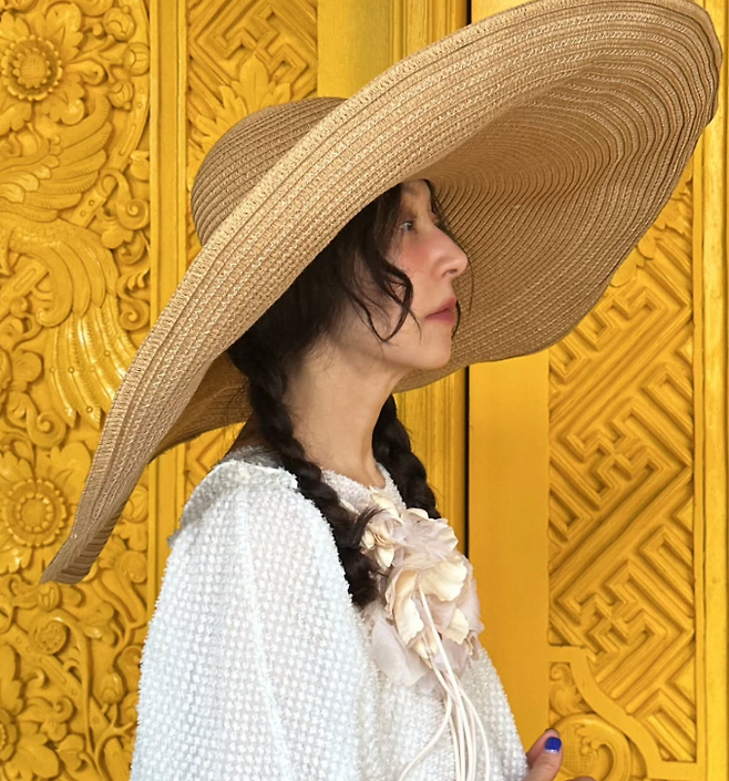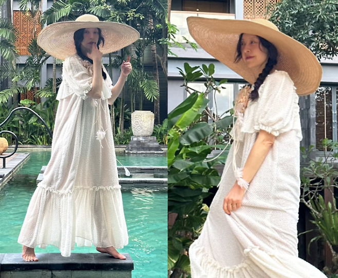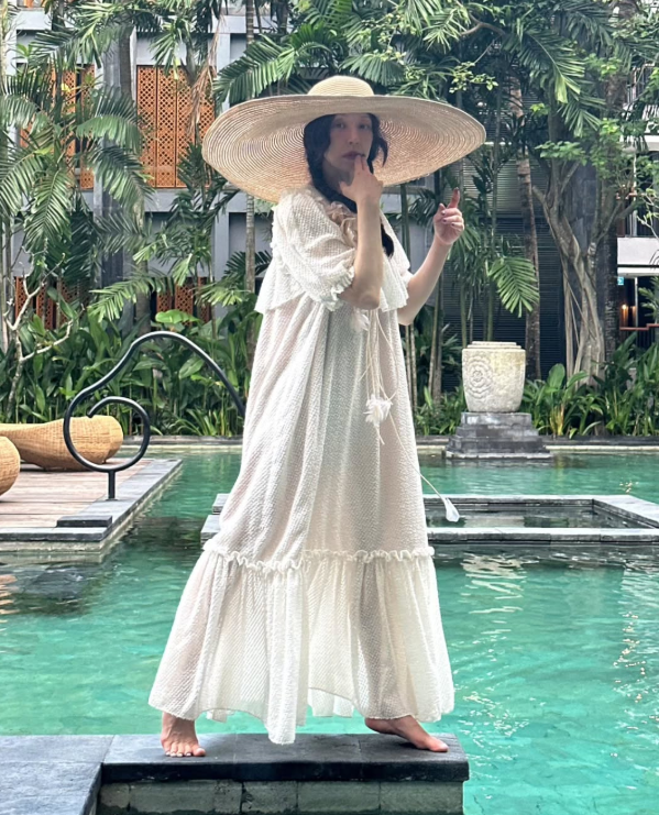 서정희는 휴양지에서 화려하지만 편안한 스타일을 자랑하는 롱원피스를 입었습니다. 화이트의 하늘하늘한 원피스는 프릴 디테일과 주름으로 페미닌한 매력을 강조했죠. 한쪽으로 땋은 머리와 넓은 챙이 있는 밀짚모자를 착용하여 발랄하면서도 세련된 분위기를 연출했습니다.