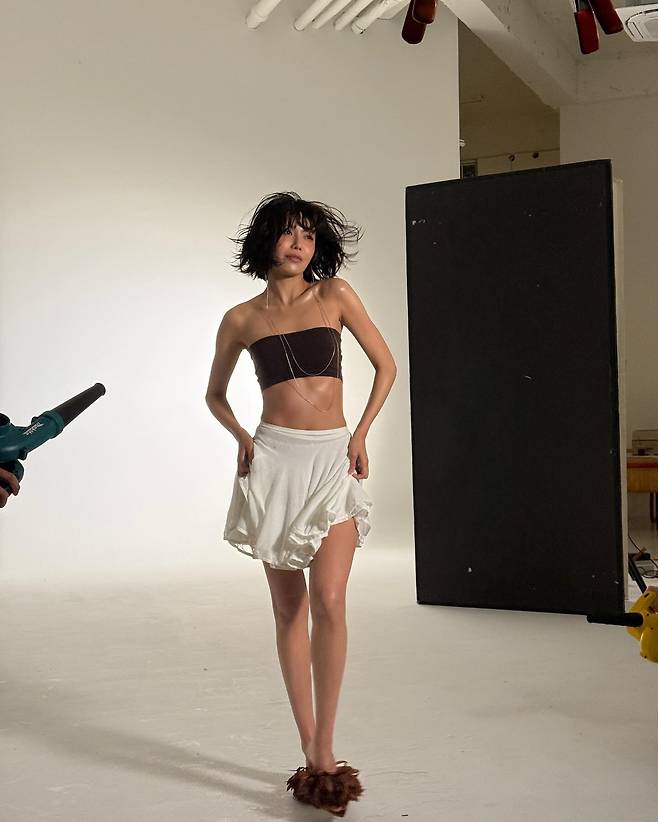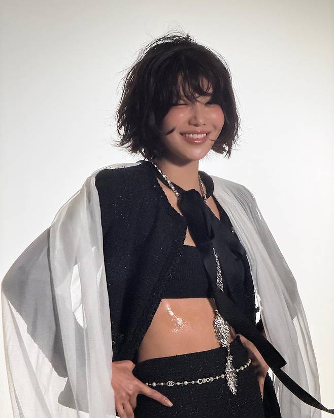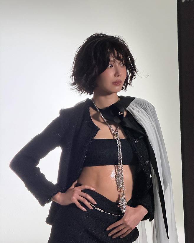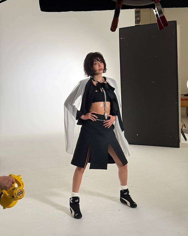 이어지는 화보 현장 컷에서는 블랙 트위드 셋업과 튜브탑, 그리고 실버 체인으로 완성한 글램 룩이 시선을 압도해요.