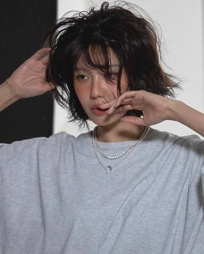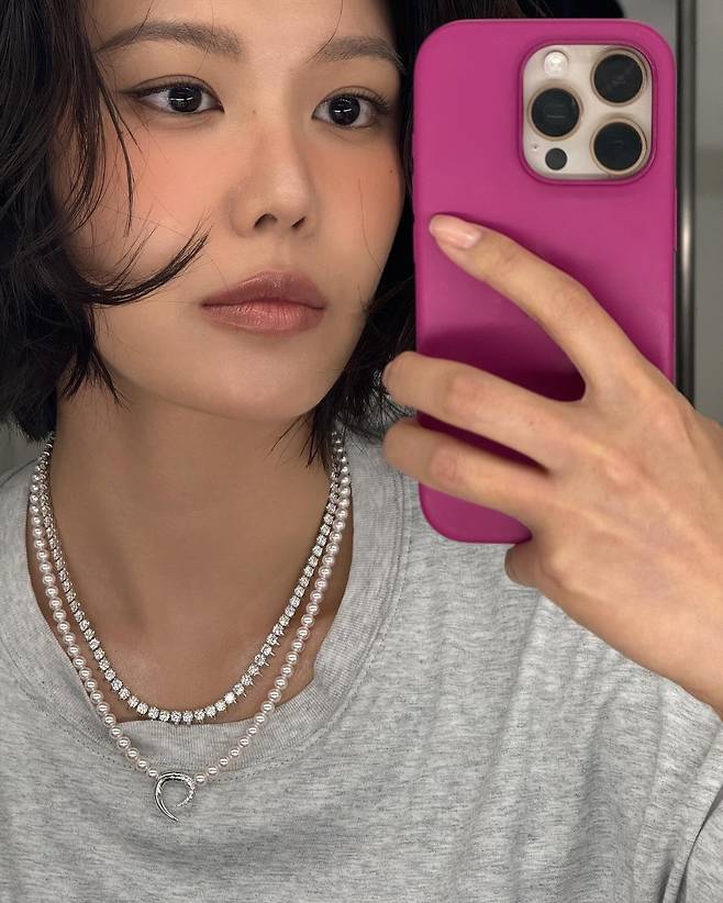 첫 번째 셀카 컷에서는 그레이 티셔츠 위로 진주와 큐빅이 레이어드된 네크리스가 포인트.