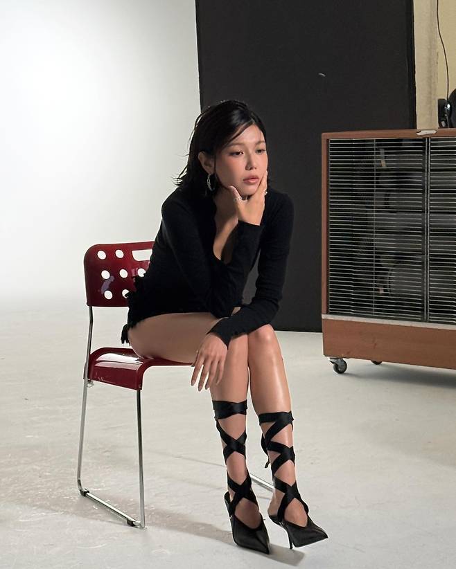 다른 컷에서는 화이트 스커트와 롱 네크리스로 꾸밈없는 여유로움을 연출했고, 마지막 촬영 컷에서는 블랙 니트와 리본 디테일의 스트랩 힐로 우아한 페미닌 무드를 보여줘요.