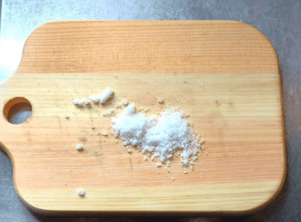 굵은 소금은 입자가 크기 때문에 도마 표면에 붙어 있는 기름때나 색소 성분을 물리적으로 제거하는 데 효과적이다. 일반적인 세척제로는 닦이지 않는 깊은 칼집 속 이물질도, 소금 입자가 마찰을 일으키며 깔끔하게 긁어낸다. 소금의 결정이 연마제 역할을 해주면서 도마 표면의 표백 효과까지 도와준다.