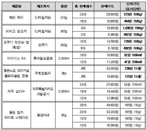 협의회는 네이버쇼핑몰 내 CJ제일제당몰에서 판매하는 비비고 왕교자(455g)와 햇반(210g·백미), 오뚜기몰에서 판매하는 오뚜기맛있는밥(200g·백미) 제품은 구매 개수가 더 많아도 단위가격이 더 비쌌다고 지적했습니다.
