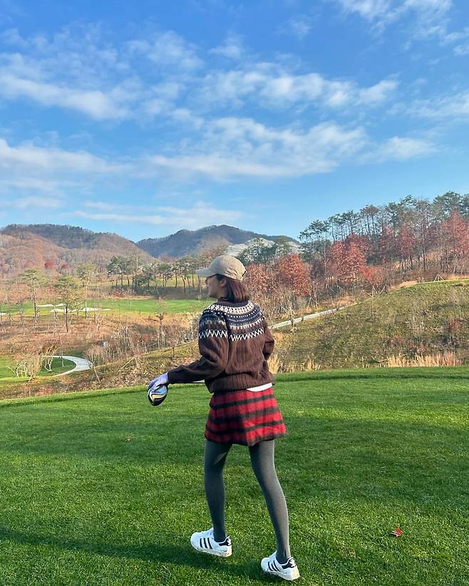 두 번째 사진에서는 골프 필드에서 따뜻하면서도 활동적인 스타일을 선보였다. 브라운 컬러의 노르딕 패턴 니트와 빨간 체크 스커트를 매치해 계절감을 살렸다. 회색 타이츠와 캡 모자를 더해 실용성을 강조했으며, 운동화로 편안함까지 놓치지 않았다.