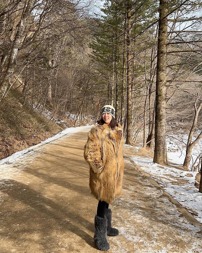 자연 속에서 포근하고 고급스러운 겨울 룩을 선보였다. 브라운 톤의 롱 퍼 코트와 털 부츠는 추운 날씨에 적합하면서도 스타일리시하다. 여기에 니트 비니를 더해 캐주얼한 감각을 살렸으며, 눈 덮인 길과 어우러져 계절감을 극대화했다.