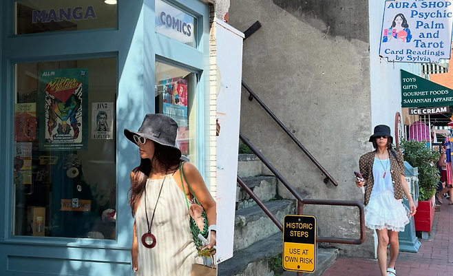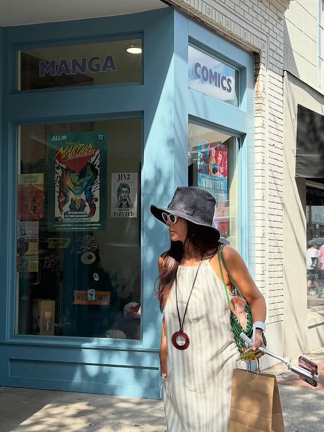화이트 스트라이프 원피스에 블랙 햇을 매치해 클래식한 여름 스타일을 완성하고 있다. 레드 포인트 액세서리와 그린 크로스백으로 컬러풀한 포인트를 주어 활기찬 분위기를 연출하고 있다.