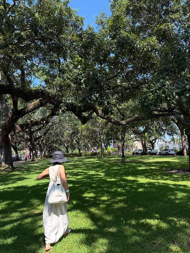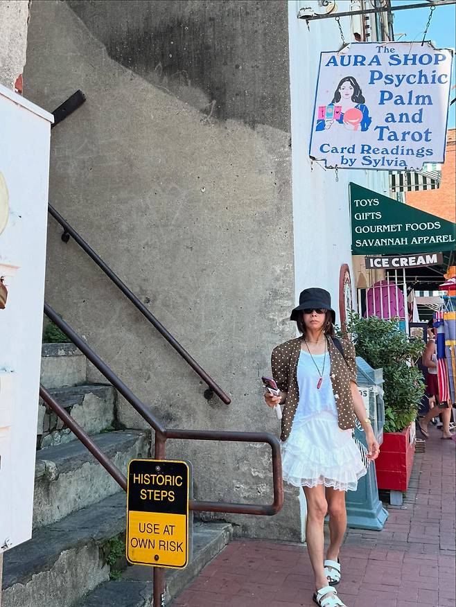 플로우한 화이트 맥시 드레스로 로맨틱한 무드를 표현하고 있다. 블랙 와이드 브림 햇과 화이트 토트백의 조합으로 미니멀하면서도 우아한 스타일링을 완성하고 있다.