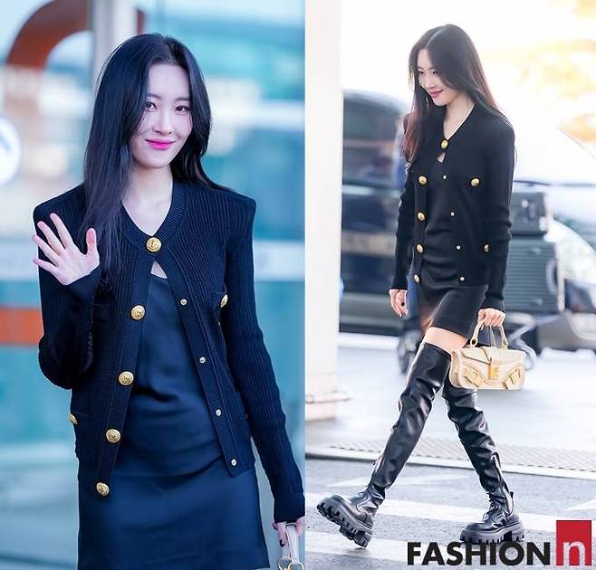 7. 가수 선미는 2월 27일 2023 F/W 파리패션위크 출굴길에 네이비 원피스와 금장 버튼 니트 카디건을 매치한 올드머니 스타일의 공항패션으로 주목을 받았다.