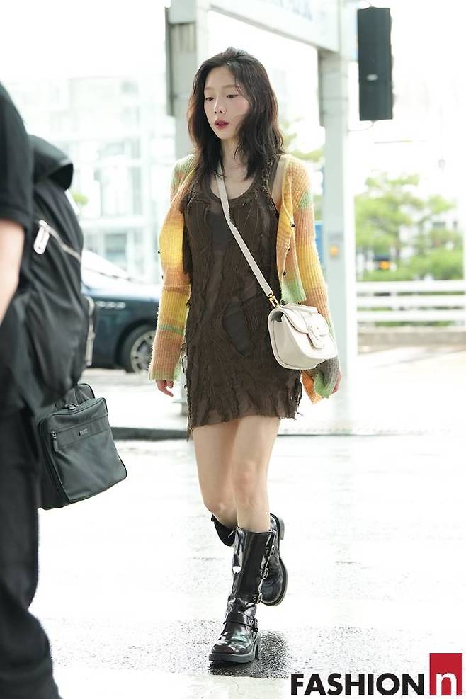 13. 소녀시대 태연은 8월 11일 태국 방콕 콘서트 참석 출국길에 그런지한 브라운 원피스에 그라데이션 파스텔톤의 카디건을 매치한 페미닌한 투피스 공항패션을 완성했다.