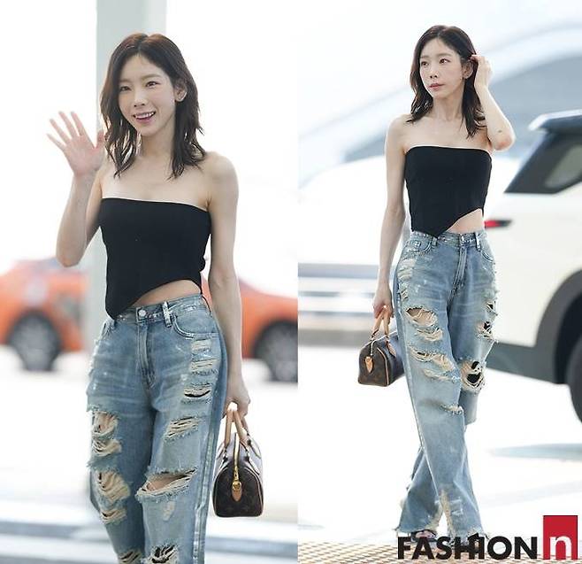 9. 소녀시대 태연은 5월 9일 홍콩 콘서트 출국길에 블랙 튜브톱에 찢어진 청바지를 입고 과감하면서도 섹시한 공항룩을 완성했다.