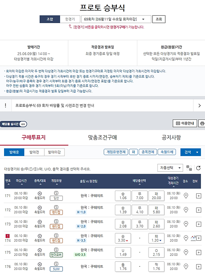 한국 vs 쿠웨이트 월드컵 아시아 예선 대상 프로토 승부식 67회차 게임 마감 임박