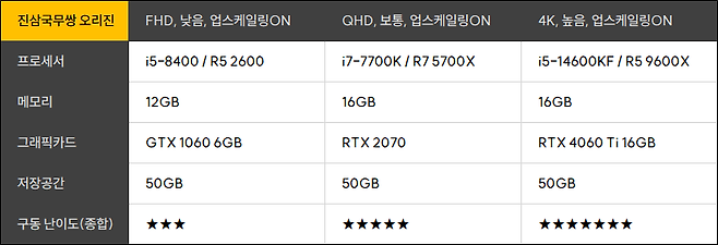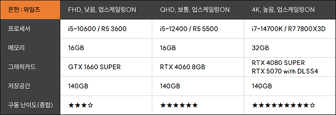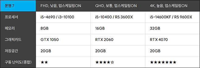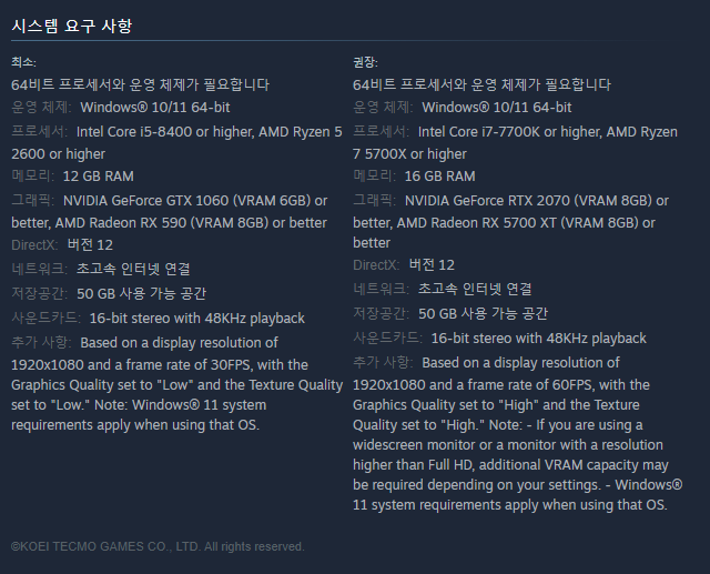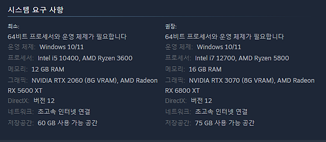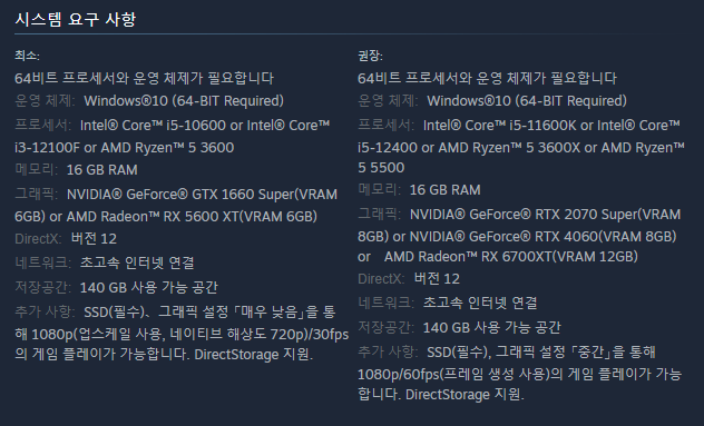 요구 사양은 높을 것으로 예상 되는데요, 개발사가 공지한 공식 권장 사양(FHD/그래픽'보통'/60fps)도 대략 5년 이내에 맞춘 PC 수준을 요구합니다. 옵션을 더 넣거나, 고주사율을 원하거나, 모니터 해상도가 더 높다면 사양이 이보다 더 높아야 되겠죠.