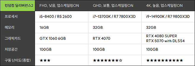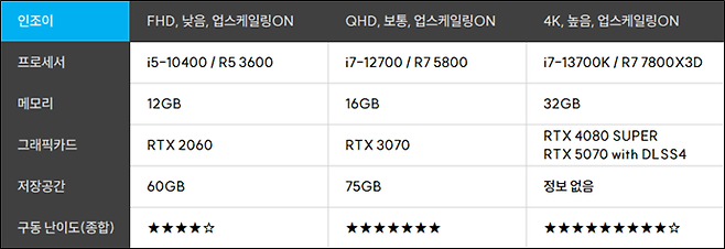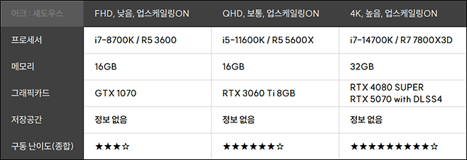 이런 전례가 있는 게임인데 심지어 2편은 7800X3D + RTX 4070 이라는 빡빡한 조합을 권장 사양으로 당당하게 공지했기 때문에, 고해상도 풀옵션은 쉽지 않을 겁니다. 고해상도에서 고주사율까지 충족하려면 새로 나오는 RTX 50 시리즈와 DLSS4의 힘이 필수일 수도 있겠네요.
