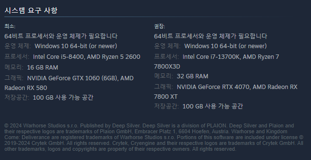 사양은 높을 것으로 예상 됩니다. 참고로 전편(2018년 출시)은 제작사가 공개한 요구 사양은 만만했는데요 실제 게임에서는 해상도와 그래픽 옵션을 높이면 그 당시 기준으로는 만만한 게임이 아니었어요.