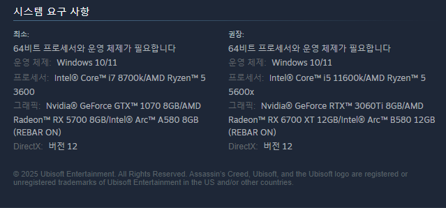 게임사가 공지한 요구 사양은 요즘 게임 치고는 낮습니다. 건물과 환경 묘사가 디테일해졌지만 극한의 사양을 요구할 정도는 아닌 것 같고, 낮은 그래픽 옵션에서는 최적화도 잘된 것 같습니다.