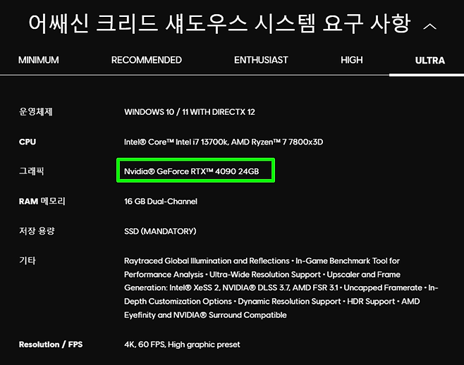 최고 사양은 개발사 공식 홈페이지에 별도로 공지돼 있습니다. 무려 RTX 4090을 요구합니다. 다만 이 공지사항이 RTX 50 시리즈와 DLSS4 공개 이전에 만들어진 자료이기 때문에, 향후 RTX 50 시리즈가 출시되면 약간 완화될 가능성은 있습니다. 그래서 실제로는 RTX 4080 SUPER 또는 RTX 5070 정도에 DLSS4 기능을 사용하면 4K 해상도도 플레이가 가능할 것으로 예상됩니다.