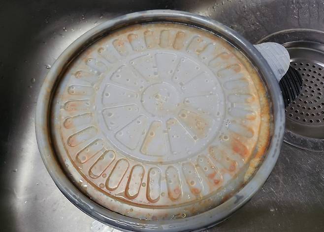 음식물 국물이나 기름기를 물로 가볍게 헹궈냅니다.