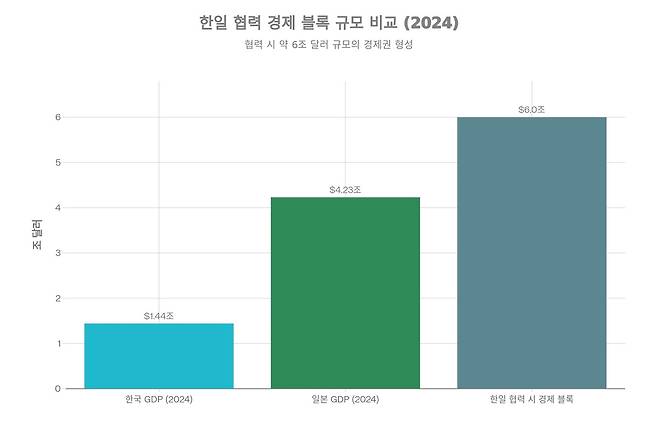미국(약 28조 달러), 중국(약 17조 달러), 유럽연합(약 17조 달러) 다음으로 막강한 경제 블록이 될 수 있다는 의미다. 이는 한국과 일본이 개별적으로는 미중 경쟁 질서에서 밀려날 수밖에 없다는 위기 인식에서 비롯된 것이다.