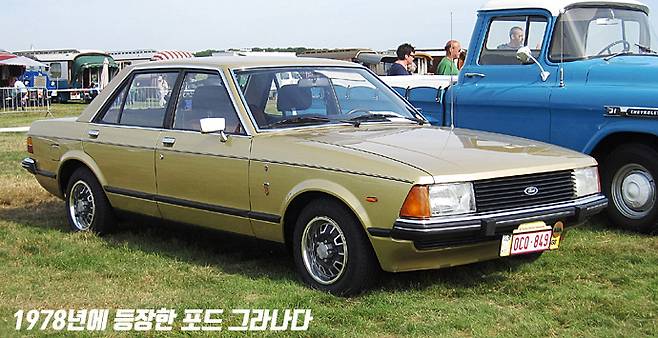 1978년에 현대자동차는 독일 포드가 개발한 대형 세단 그라나다(Granada)를 내놓습니다. 직선적 디자인의 그라나다는 유럽 포드가 유행시킨 사각형 헤드램프와 수평형 그릴의 전면 디자인이 특징인 국내 최고급 승용차였습니다. 게다가 은색으로 칠해진 게 대부분이었던 스틸 휠에 검은 색을 적용해서 휠 이미지도 매우 독특했습니다.