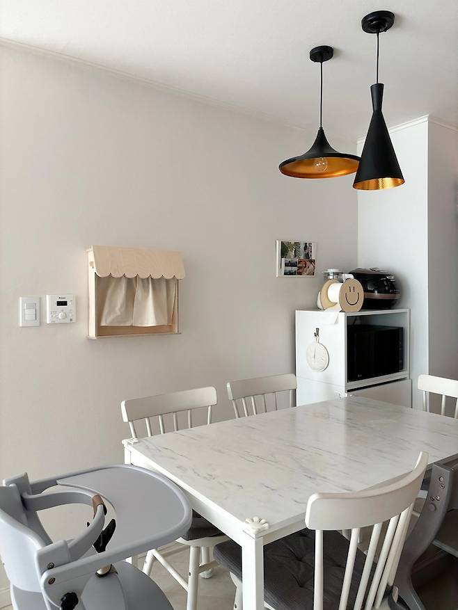 가족들이 도란도란 앉아 식사하는 곳이에요. 각진 식탁이라 아이들이 왔다갔다 하다 식탁 모서리에 부딪히지 않도록 모서리 보호대를 붙여두었어요. 인터폰은 소품으로 가렸는데 말하지 않으면 모르게 감쪽같고 볼 때마다 귀여워요.