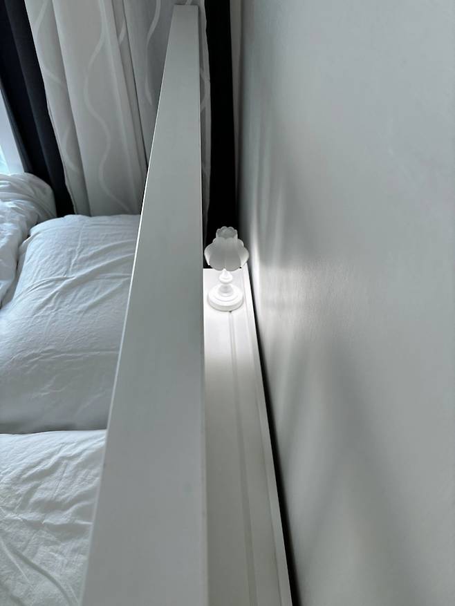 침실의 '히든 공간'을 소개해요. 잘 때 핸드폰, 안경 등을 협탁에 두면 되지만 협탁이 먼 쪽에서 자는 사람은 핸드폰 두는 게 번거롭더라구요. 그래서 남편이 생각해낸 아이디어는 침대 프레임에 액자 선반을 달자는 것이었어요.