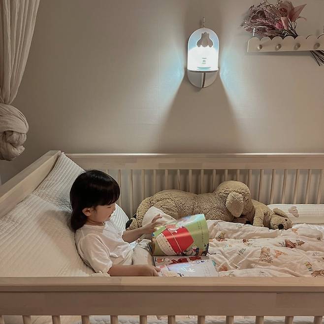 아이방 등은 리모콘으로 조절할 수 있는 LED라 밝기 조절, 색온도 조절이 입맛에 맞춰 모두 돼요. 밤에는 눈이 편안한 색으로 밝지 않게 은은하게 조절해서 켜두는데 스탠드 무드등 켜고 책 읽는 걸 아이가 좋아해요.