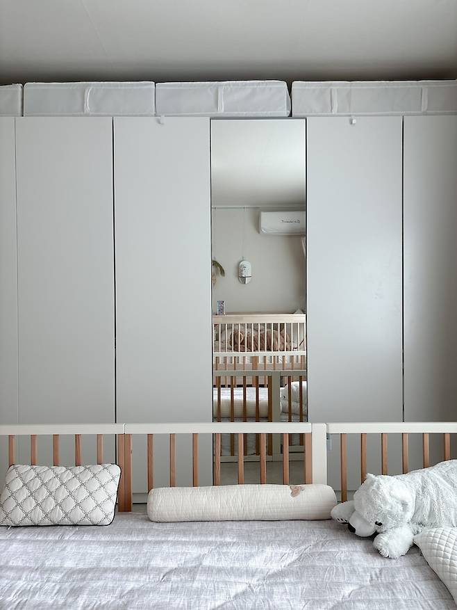 한쪽에는 옷장이 있고, 옷장 위 공간을 활용해 수납 정리함에 계절 지난 아이들 옷이나 자주 사용하지 않는 용품을 보관하고 있어요.