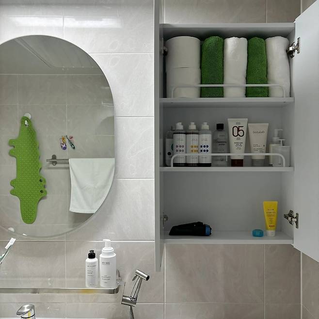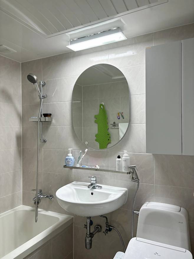 욕실은 다른 곳에 비해 비교적 깨끗한 편이라 남편과 필요한 부분만 셀프로 고쳤어요. 교체한 부분은 선반, 수건걸이, 거울, 욕실장, 휴지걸이에요. 변기 위 선반과 세면대에 있던 컵걸이를 제거하고 세면대 위로 선반을 설치했더니 관리가 편해졌어요.
