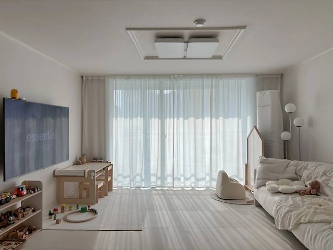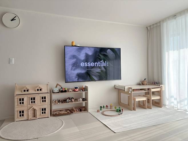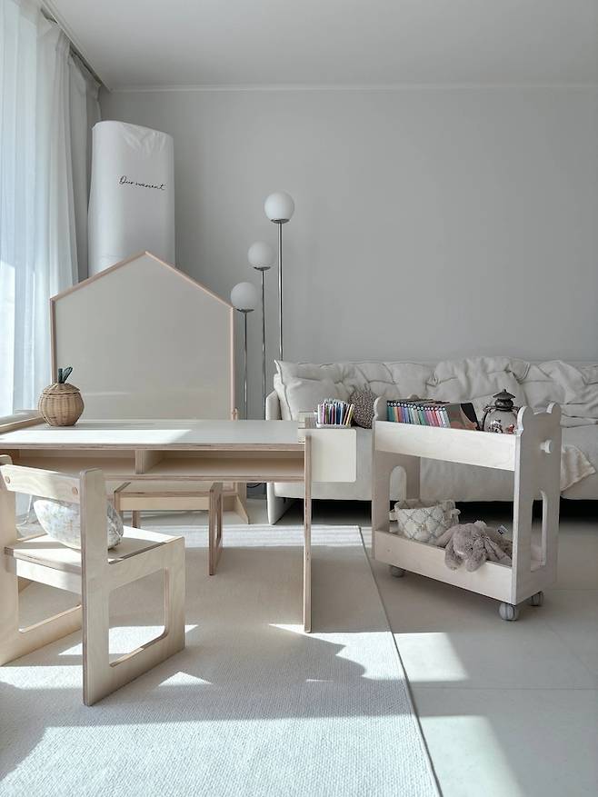 이전에 놀이방을 따로 만들었었는데 집안일 할 때 아이를 볼 수 없어 신경이 계속 쓰이더라구요. 거실에 책상과 자석 보드, 책 읽을 수 있는 환경을 만들어주니 아이들은 넓은 거실에서 즐겁게 시간을 보내고, 아이들이 노는 모습을 볼 수 있는 점이 좋아요.