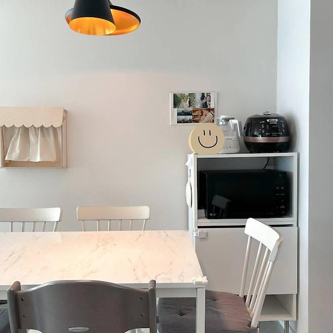 사진이 붙어있는 곳은 전기 차단기에요. 어떻게 가릴까 생각하다가 인화한 사진을 몇 장 붙여두었어요. 전자레인지장은 이케아 제품인데 사진처럼 세트로 판매하는 제품은 아니고 하부장, 상부장을 따로 골라서 조립했어요.
