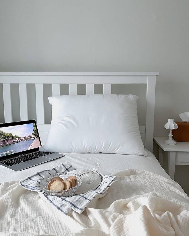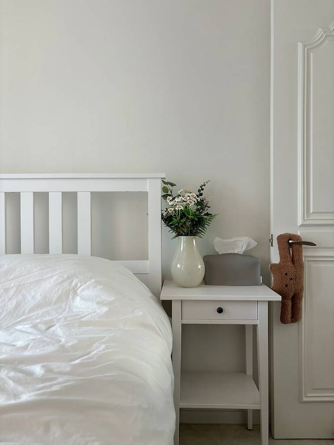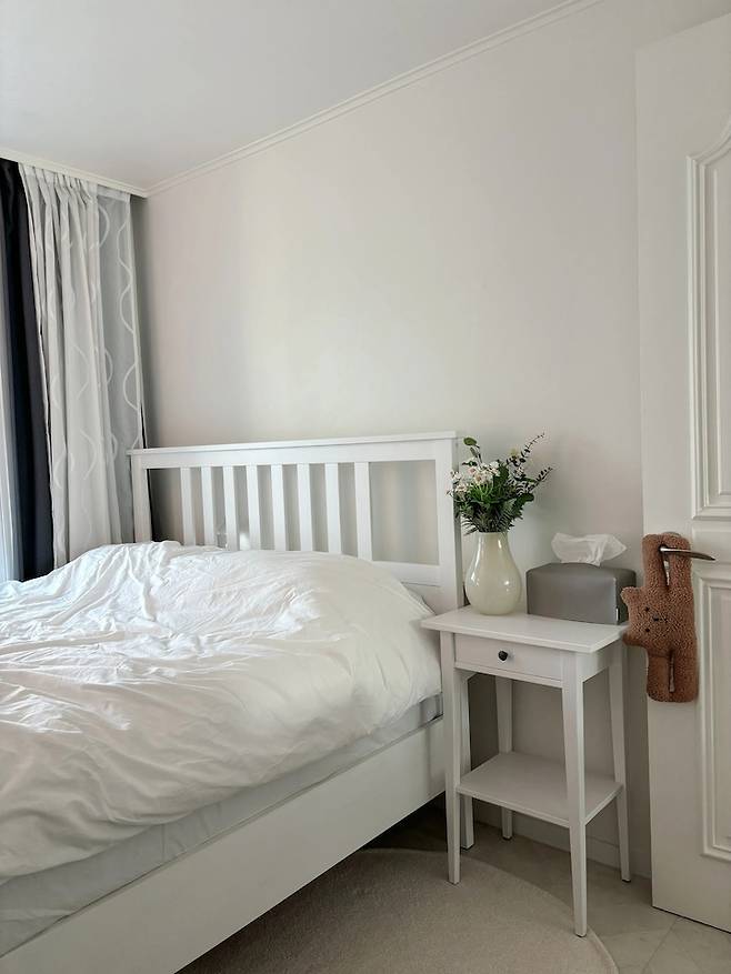 보통 속커튼을 안쪽에, 암막 커튼을 바깥으로 하는데 암막 커튼이 그레이 색상이라 방이 어두워 보여서 발상의 전환으로 암막 커튼을 안쪽, 속커튼을 바깥으로 달아서 어두운 느낌을 최대한 뺐어요. 화이트 침구는 깨끗해 보이고 호텔에 온 것 같은 기분이 들기도 해요. 요즘은 바스락거리는 이불에 푹 빠져있어요.