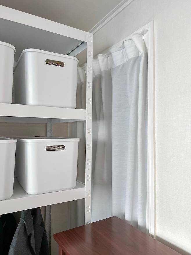 팬트리 옆으로는 붙박이장이 있어요. 문을 없애고 커튼을 달아두니 공간을 효율적으로 활용할 수 있게 되었어요.